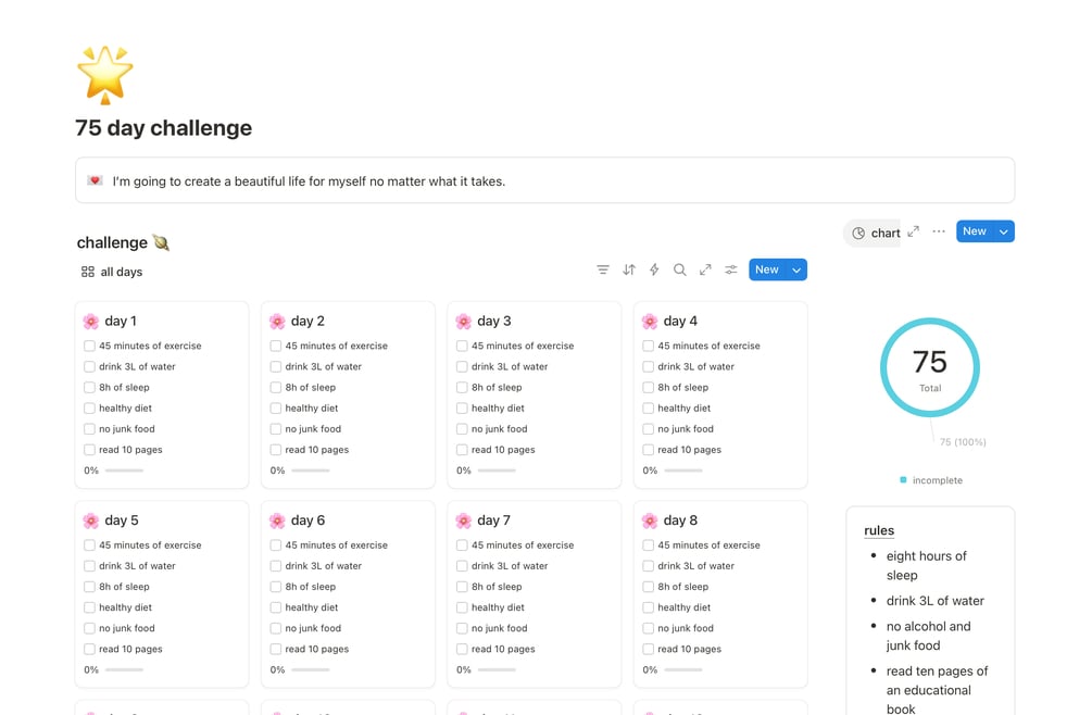 Whether you're doing 75 Hard or your own version, this template keeps you motivated and organized — all in one place.